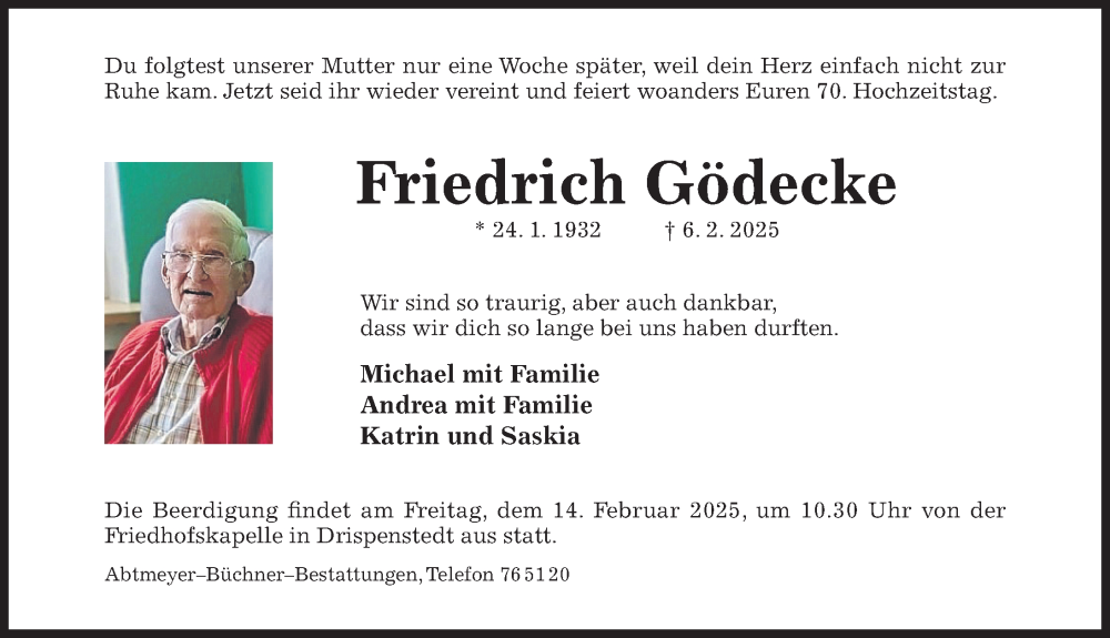 Hier finden Sie alle Traueranzeigen aus der Zeitung, die bisher für Friedrich Gödecke erschienen sind. Weitere Traueranzeigen, die in der Zeitung erscheinen, werden hier ebenfalls aufgelistet
