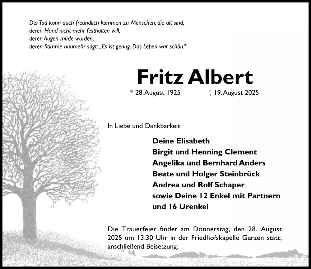 Hier finden Sie alle Traueranzeigen aus der Zeitung, die bisher für Fritz Albert erschienen sind. Weitere Traueranzeigen, die in der Zeitung erscheinen, werden hier ebenfalls aufgelistet
