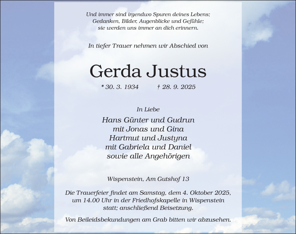 Hier finden Sie alle Traueranzeigen aus der Zeitung, die bisher für Gerda Justus erschienen sind. Weitere Traueranzeigen, die in der Zeitung erscheinen, werden hier ebenfalls aufgelistet