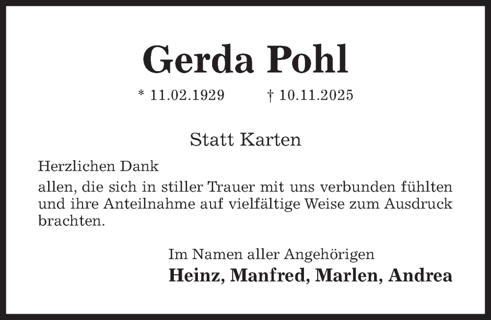 Hier finden Sie alle Traueranzeigen aus der Zeitung, die bisher für Gerda Pohl erschienen sind. Weitere Traueranzeigen, die in der Zeitung erscheinen, werden hier ebenfalls aufgelistet
