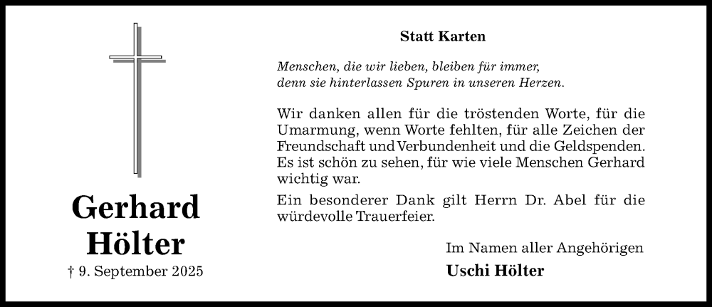Hier finden Sie alle Traueranzeigen aus der Zeitung, die bisher für Gerhard Hölter erschienen sind. Weitere Traueranzeigen, die in der Zeitung erscheinen, werden hier ebenfalls aufgelistet