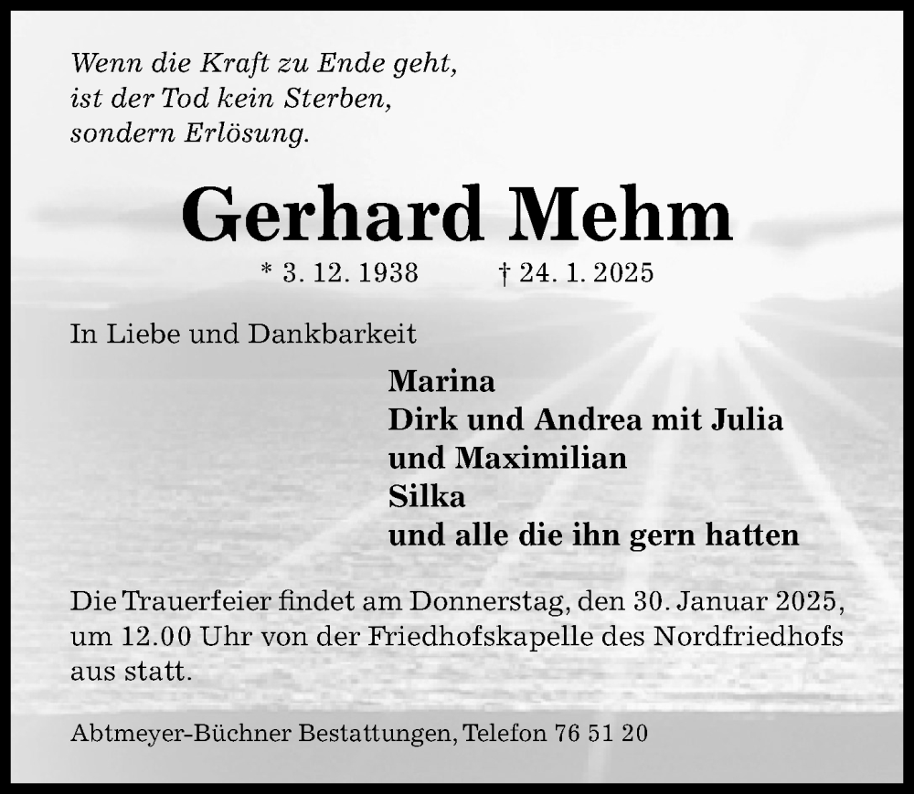 Hier finden Sie alle Traueranzeigen aus der Zeitung, die bisher für Gerhard Mehm erschienen sind. Weitere Traueranzeigen, die in der Zeitung erscheinen, werden hier ebenfalls aufgelistet