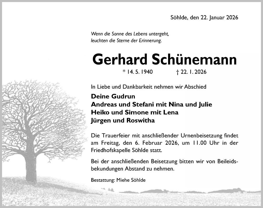 Hier finden Sie alle Traueranzeigen aus der Zeitung, die bisher für Gerhard Schünemann erschienen sind. Weitere Traueranzeigen, die in der Zeitung erscheinen, werden hier ebenfalls aufgelistet