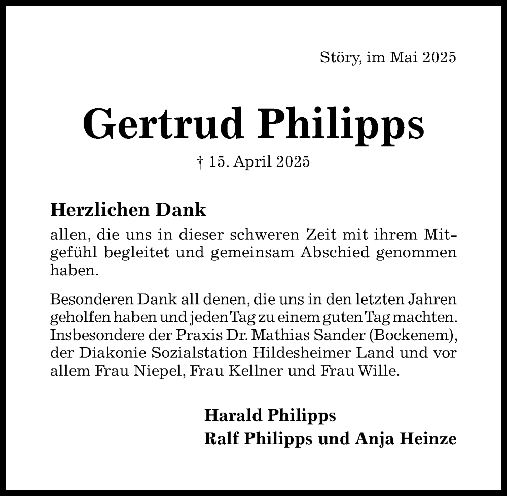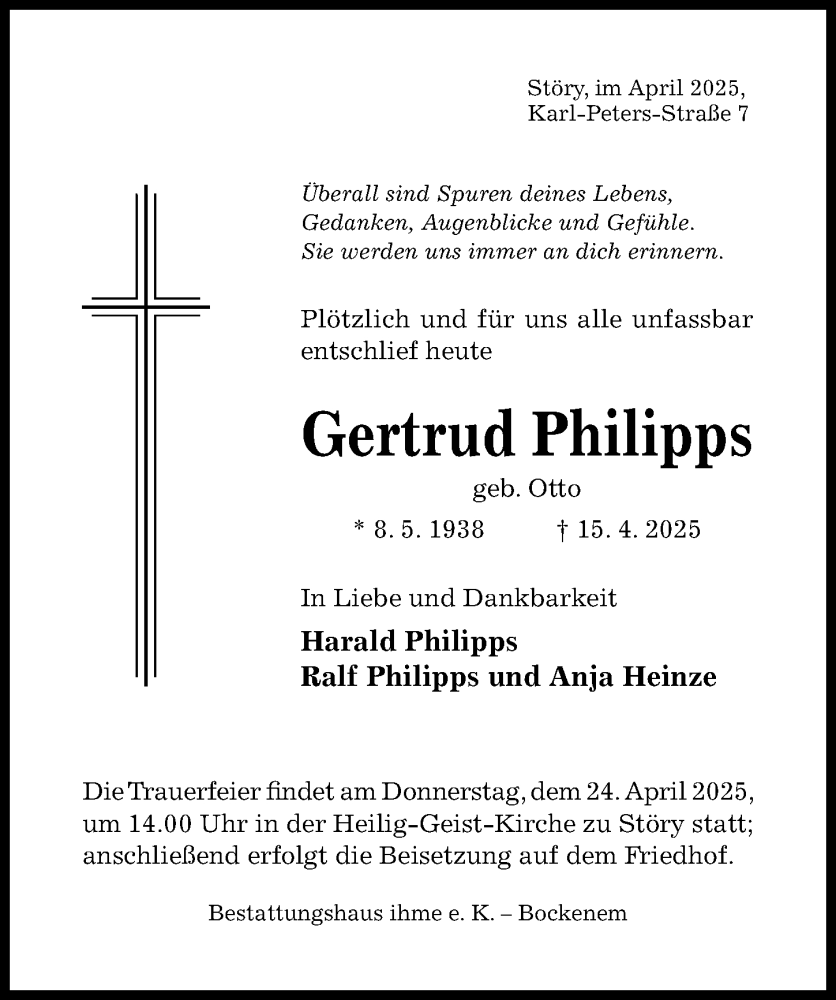 Hier finden Sie alle Traueranzeigen aus der Zeitung, die bisher für Gertrud Philipps erschienen sind. Weitere Traueranzeigen, die in der Zeitung erscheinen, werden hier ebenfalls aufgelistet