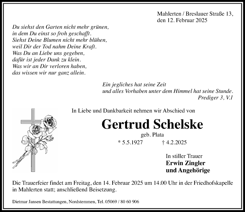 Hier finden Sie alle Traueranzeigen aus der Zeitung, die bisher für Gertrud Schelske erschienen sind. Weitere Traueranzeigen, die in der Zeitung erscheinen, werden hier ebenfalls aufgelistet