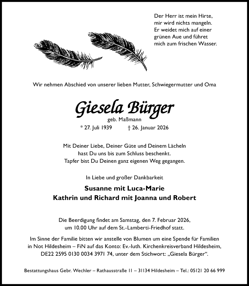 Hier finden Sie alle Traueranzeigen aus der Zeitung, die bisher für Giesela Bürger erschienen sind. Weitere Traueranzeigen, die in der Zeitung erscheinen, werden hier ebenfalls aufgelistet