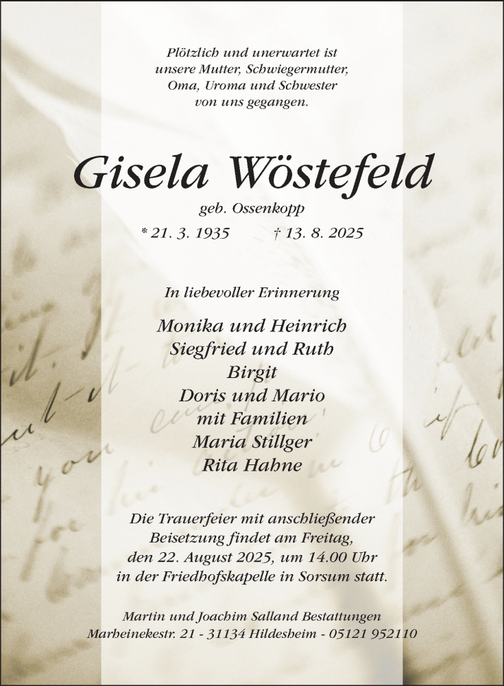 Hier finden Sie alle Traueranzeigen aus der Zeitung, die bisher für Gisela Wöstefeld erschienen sind. Weitere Traueranzeigen, die in der Zeitung erscheinen, werden hier ebenfalls aufgelistet