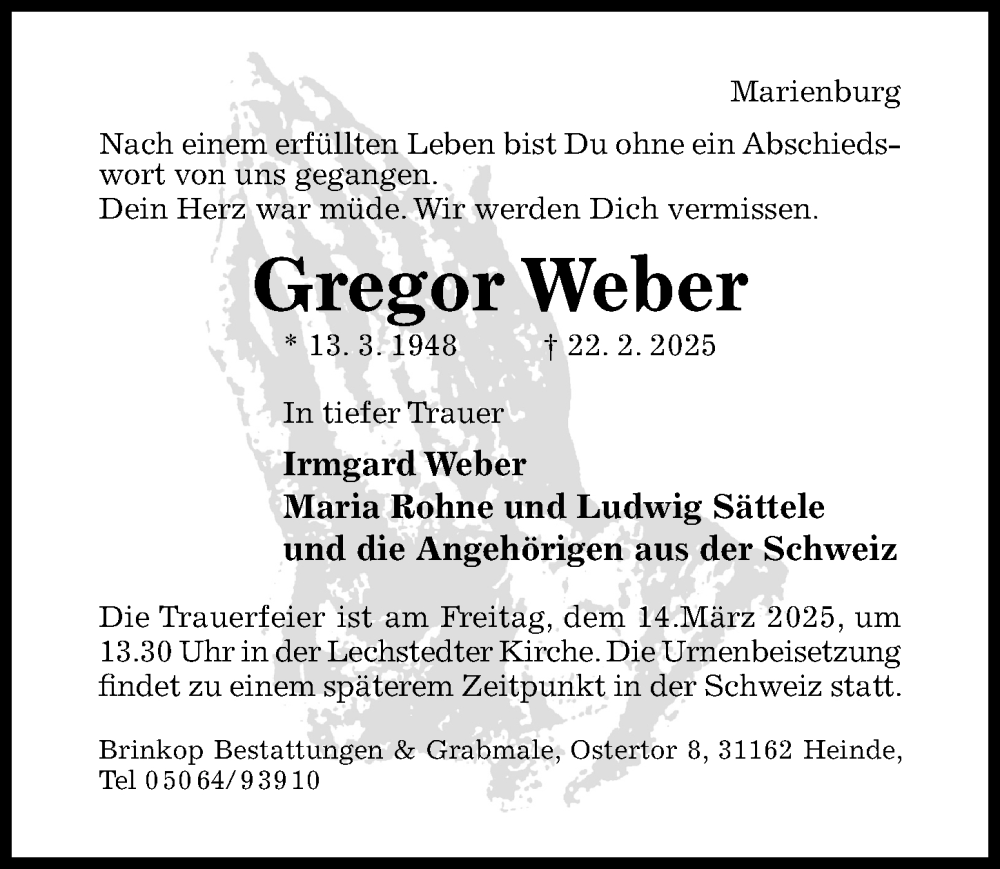Hier finden Sie alle Traueranzeigen aus der Zeitung, die bisher für Gregor Weber erschienen sind. Weitere Traueranzeigen, die in der Zeitung erscheinen, werden hier ebenfalls aufgelistet