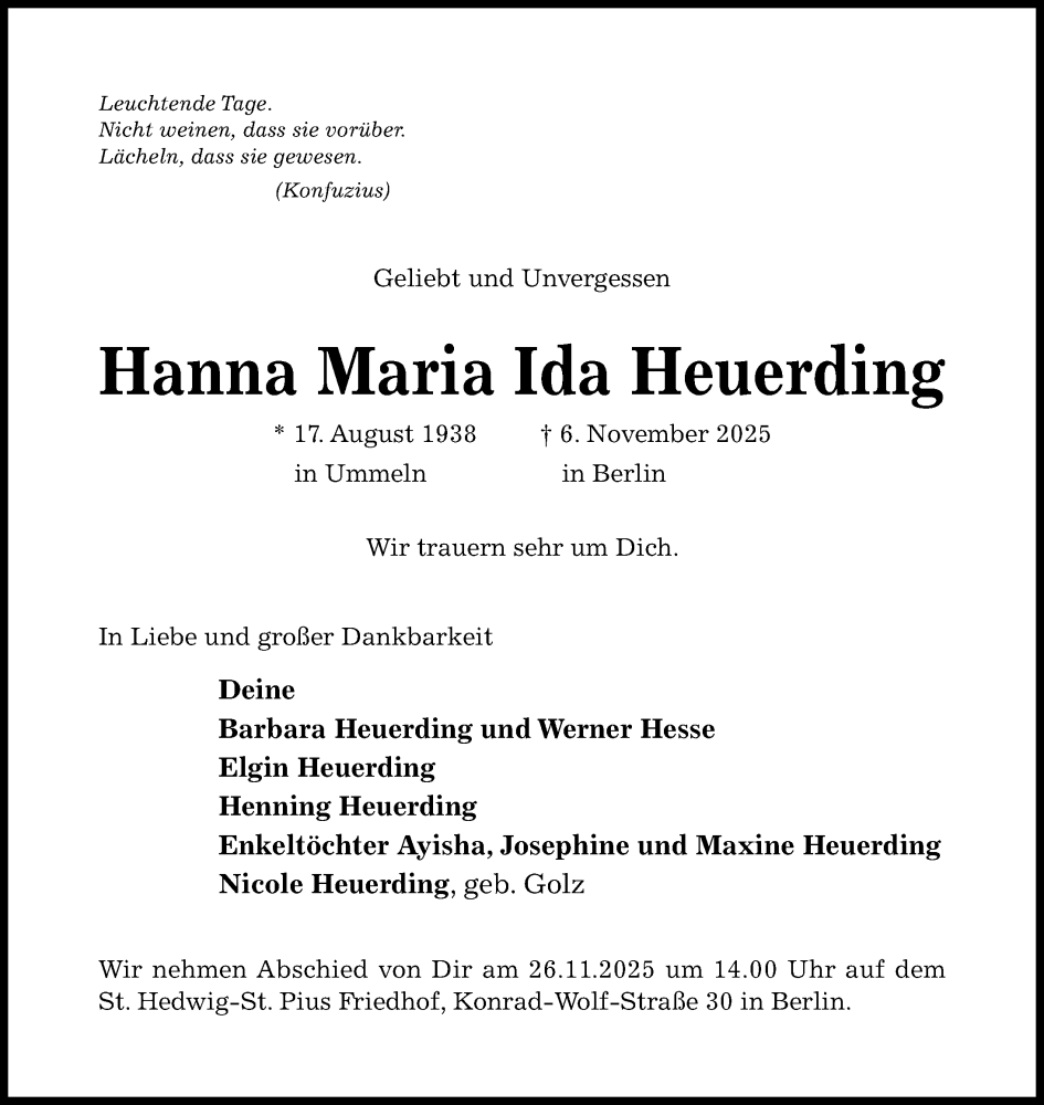 Hier finden Sie alle Traueranzeigen aus der Zeitung, die bisher für Hanna Maria Ida Heuerding erschienen sind. Weitere Traueranzeigen, die in der Zeitung erscheinen, werden hier ebenfalls aufgelistet