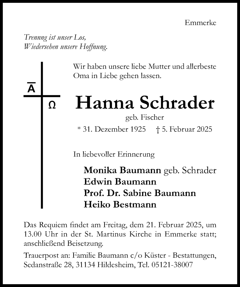 Hier finden Sie alle Traueranzeigen aus der Zeitung, die bisher für Hanna Schrader erschienen sind. Weitere Traueranzeigen, die in der Zeitung erscheinen, werden hier ebenfalls aufgelistet