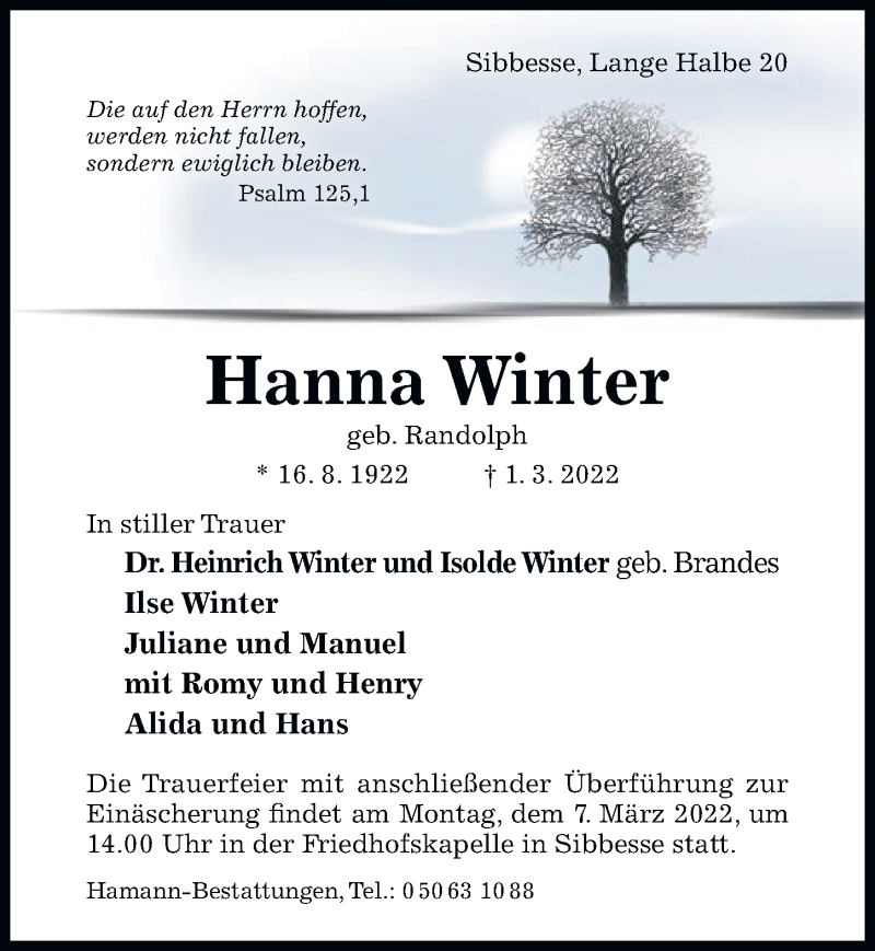 Hier finden Sie alle Traueranzeigen aus der Zeitung, die bisher für Hanna Winter erschienen sind. Weitere Traueranzeigen, die in der Zeitung erscheinen, werden hier ebenfalls aufgelistet