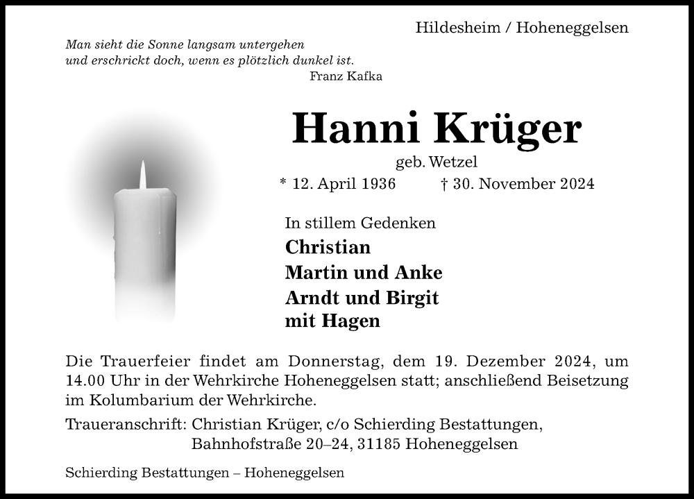 Hier finden Sie alle Traueranzeigen aus der Zeitung, die bisher für Hanni Krüger erschienen sind. Weitere Traueranzeigen, die in der Zeitung erscheinen, werden hier ebenfalls aufgelistet