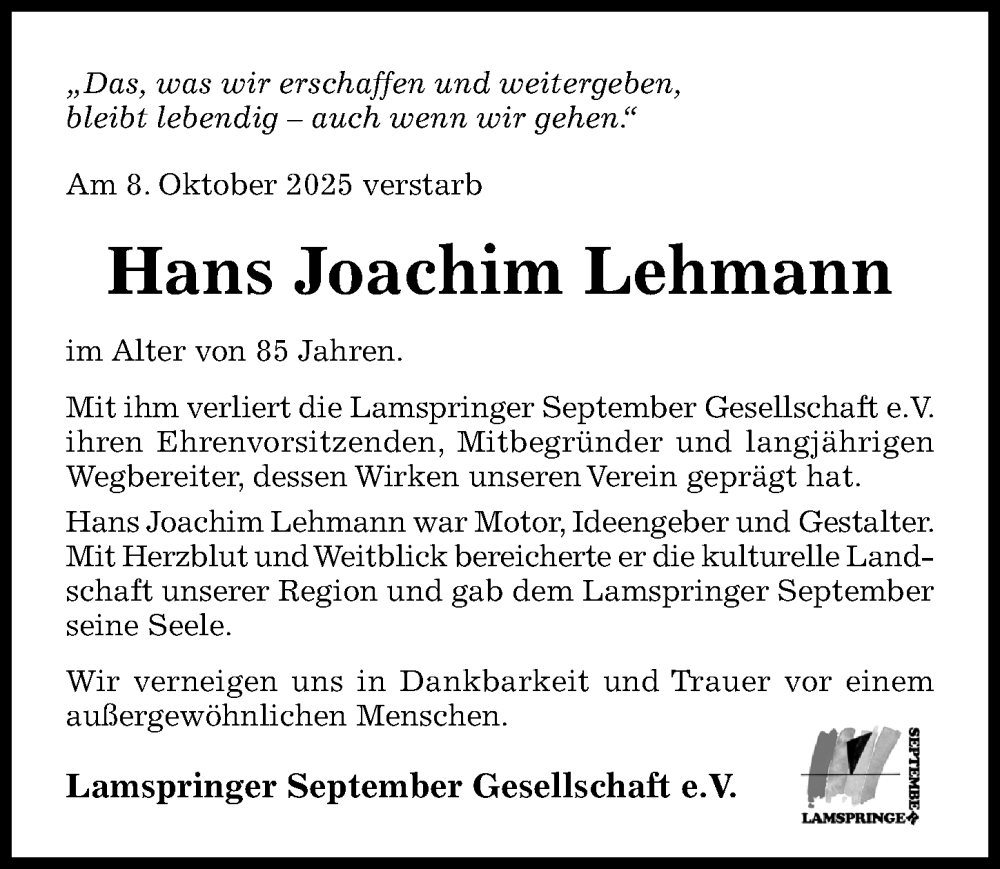 Hier finden Sie alle Traueranzeigen aus der Zeitung, die bisher für Hans Joachim Lehmann erschienen sind. Weitere Traueranzeigen, die in der Zeitung erscheinen, werden hier ebenfalls aufgelistet