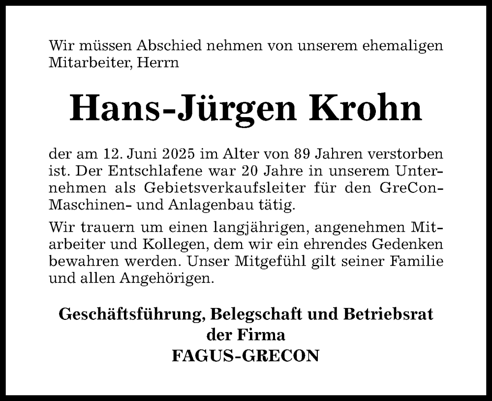 Hier finden Sie alle Traueranzeigen aus der Zeitung, die bisher für Hans-Jürgen Krohn erschienen sind. Weitere Traueranzeigen, die in der Zeitung erscheinen, werden hier ebenfalls aufgelistet