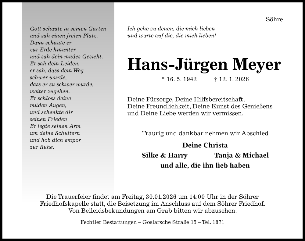 Hier finden Sie alle Traueranzeigen aus der Zeitung, die bisher für Hans-Jürgen Meyer erschienen sind. Weitere Traueranzeigen, die in der Zeitung erscheinen, werden hier ebenfalls aufgelistet