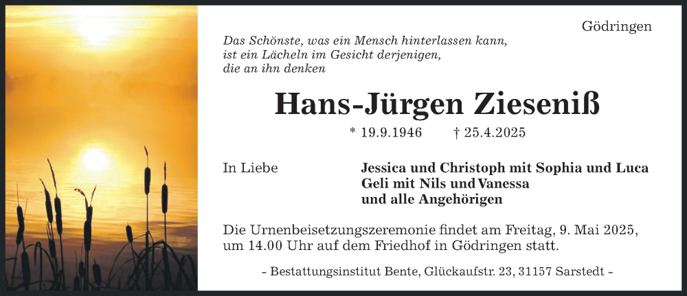 Hier finden Sie alle Traueranzeigen aus der Zeitung, die bisher für Hans-Jürgen Zieseniß erschienen sind. Weitere Traueranzeigen, die in der Zeitung erscheinen, werden hier ebenfalls aufgelistet
