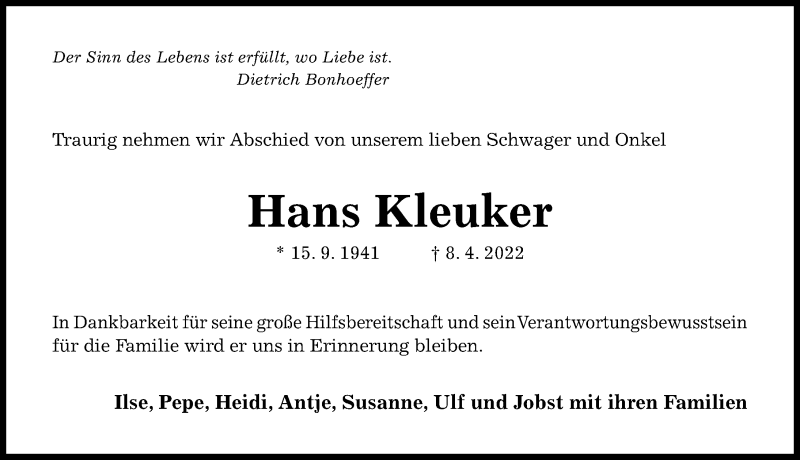 Hier finden Sie alle Traueranzeigen aus der Zeitung, die bisher für Hans Kleuker erschienen sind. Weitere Traueranzeigen, die in der Zeitung erscheinen, werden hier ebenfalls aufgelistet