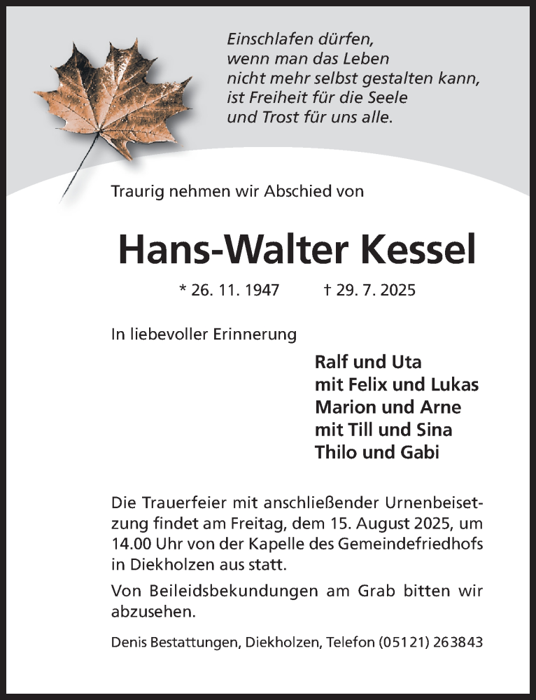 Hier finden Sie alle Traueranzeigen aus der Zeitung, die bisher für Hans-Walter Kessel erschienen sind. Weitere Traueranzeigen, die in der Zeitung erscheinen, werden hier ebenfalls aufgelistet