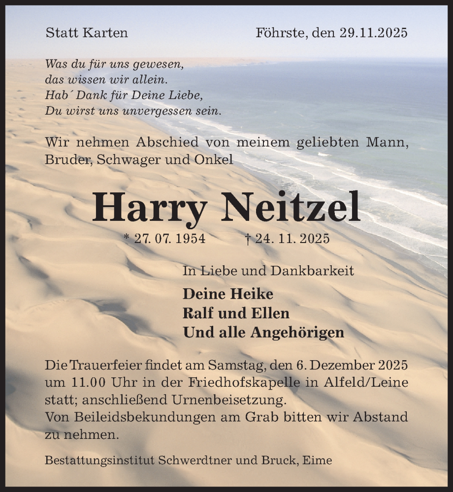 Hier finden Sie alle Traueranzeigen aus der Zeitung, die bisher für Harry Neitzel erschienen sind. Weitere Traueranzeigen, die in der Zeitung erscheinen, werden hier ebenfalls aufgelistet