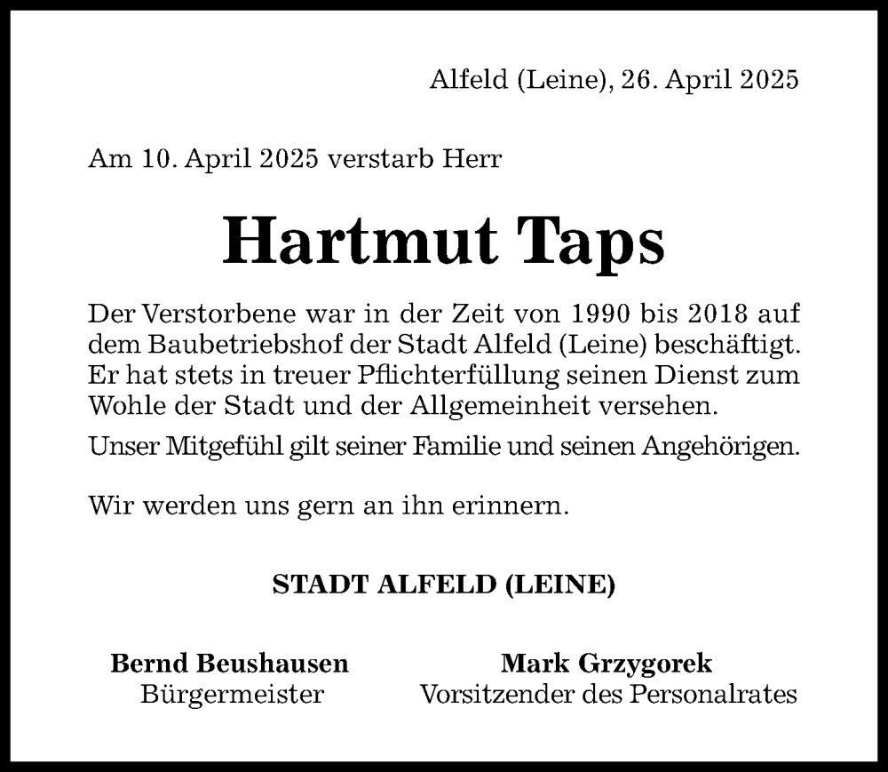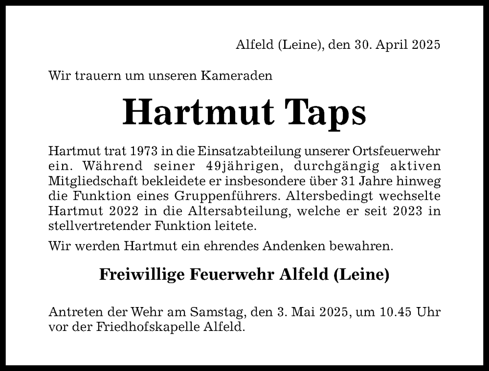 Hier finden Sie alle Traueranzeigen aus der Zeitung, die bisher für Hartmut Taps erschienen sind. Weitere Traueranzeigen, die in der Zeitung erscheinen, werden hier ebenfalls aufgelistet