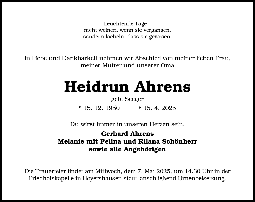 Hier finden Sie alle Traueranzeigen aus der Zeitung, die bisher für Heidrun Ahrens erschienen sind. Weitere Traueranzeigen, die in der Zeitung erscheinen, werden hier ebenfalls aufgelistet