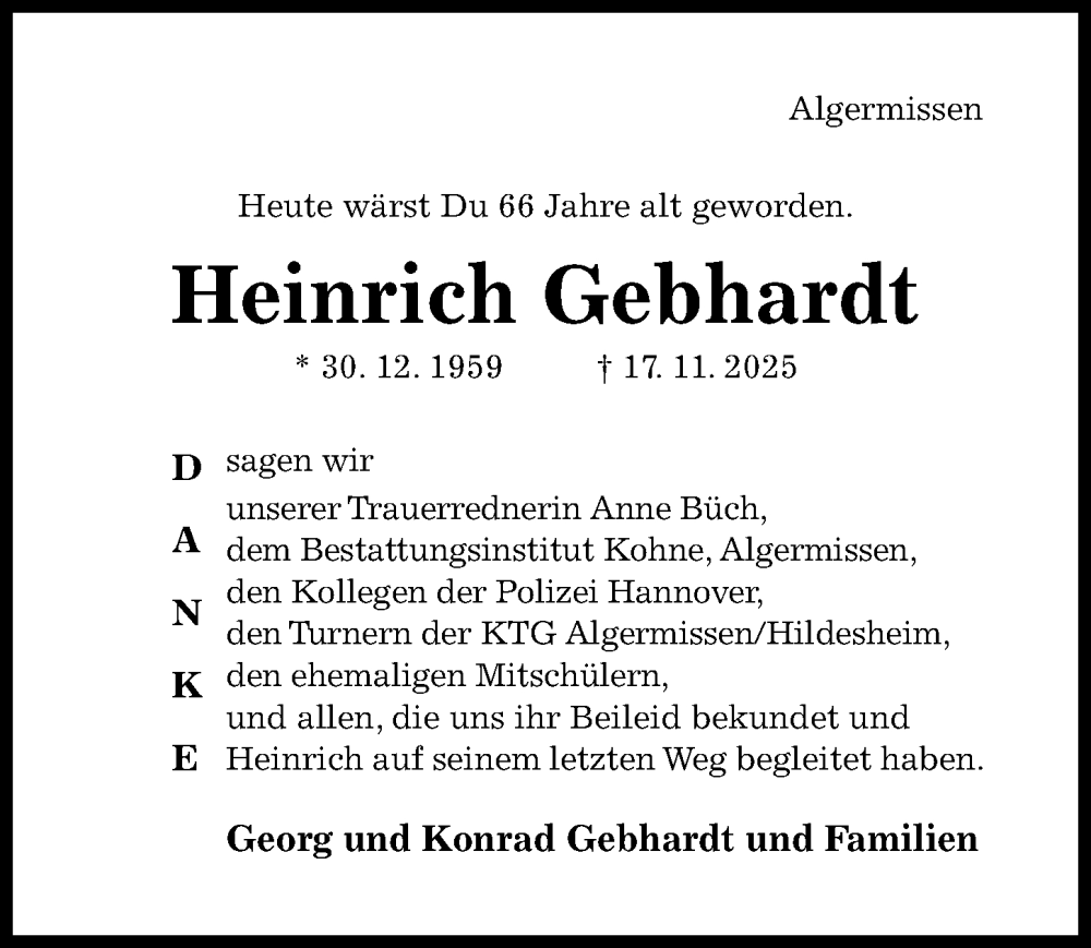 Hier finden Sie alle Traueranzeigen aus der Zeitung, die bisher für Heinrich Gebhardt erschienen sind. Weitere Traueranzeigen, die in der Zeitung erscheinen, werden hier ebenfalls aufgelistet