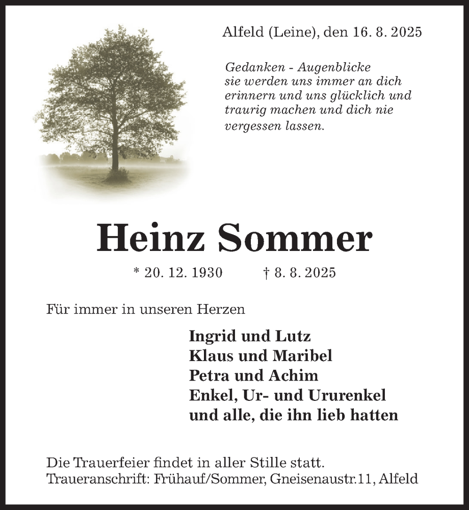 Hier finden Sie alle Traueranzeigen aus der Zeitung, die bisher für Heinz Sommer erschienen sind. Weitere Traueranzeigen, die in der Zeitung erscheinen, werden hier ebenfalls aufgelistet