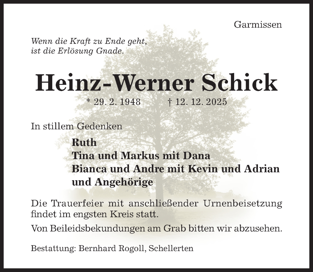 Hier finden Sie alle Traueranzeigen aus der Zeitung, die bisher für Heinz-Werner Schick erschienen sind. Weitere Traueranzeigen, die in der Zeitung erscheinen, werden hier ebenfalls aufgelistet