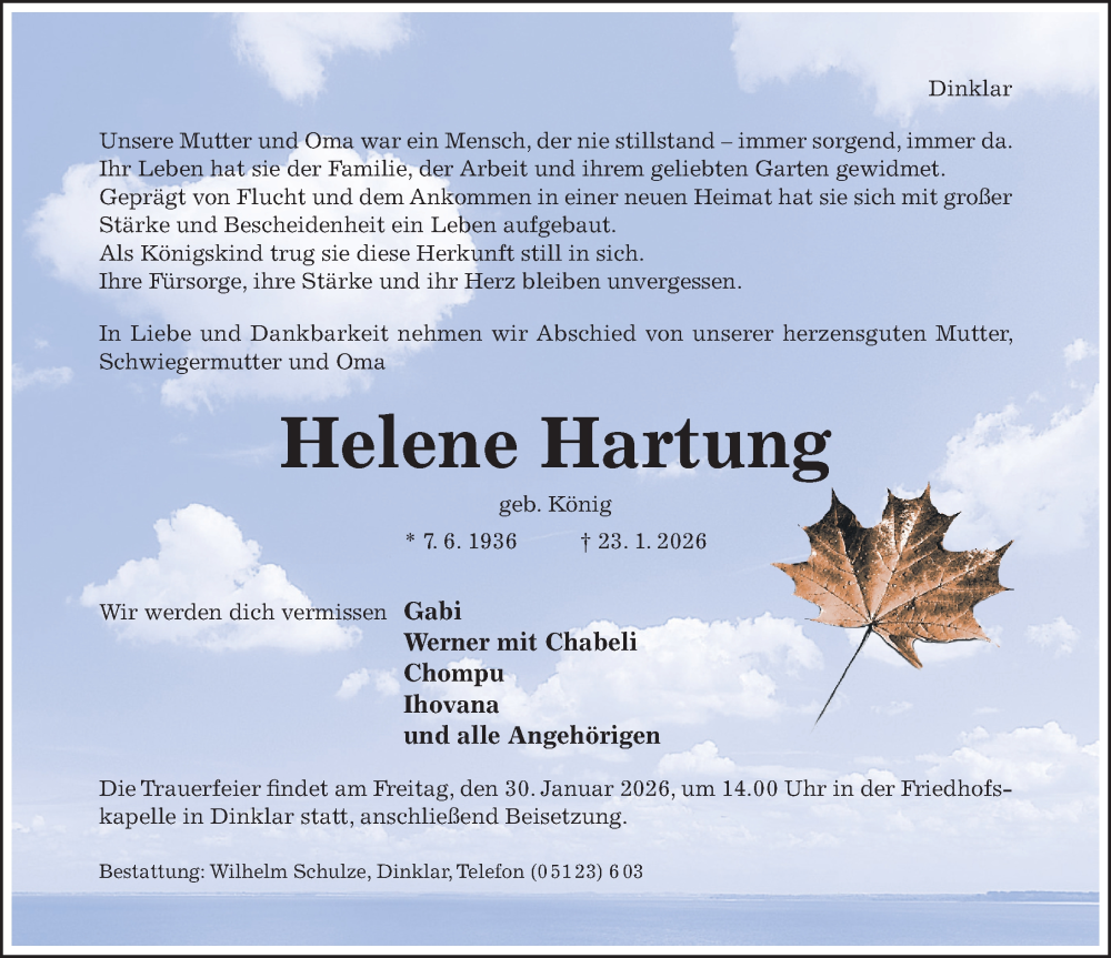 Hier finden Sie alle Traueranzeigen aus der Zeitung, die bisher für Helene Hartung erschienen sind. Weitere Traueranzeigen, die in der Zeitung erscheinen, werden hier ebenfalls aufgelistet