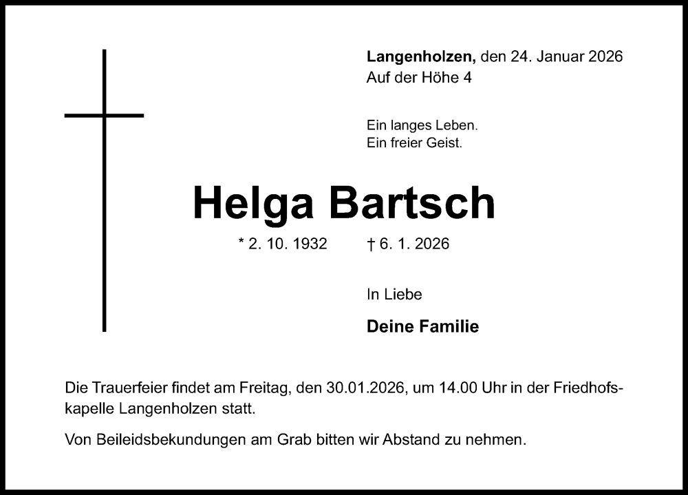 Hier finden Sie alle Traueranzeigen aus der Zeitung, die bisher für Helga Bartsch erschienen sind. Weitere Traueranzeigen, die in der Zeitung erscheinen, werden hier ebenfalls aufgelistet