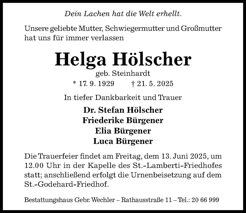 Hier finden Sie alle Traueranzeigen aus der Zeitung, die bisher für Helga Hölscher erschienen sind. Weitere Traueranzeigen, die in der Zeitung erscheinen, werden hier ebenfalls aufgelistet