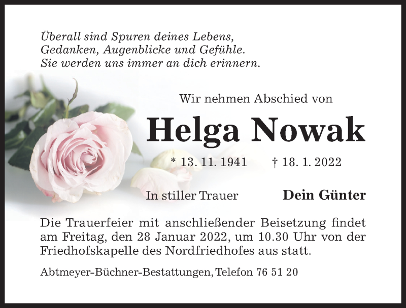 Hier finden Sie alle Traueranzeigen aus der Zeitung, die bisher für Helga Nowak erschienen sind. Weitere Traueranzeigen, die in der Zeitung erscheinen, werden hier ebenfalls aufgelistet