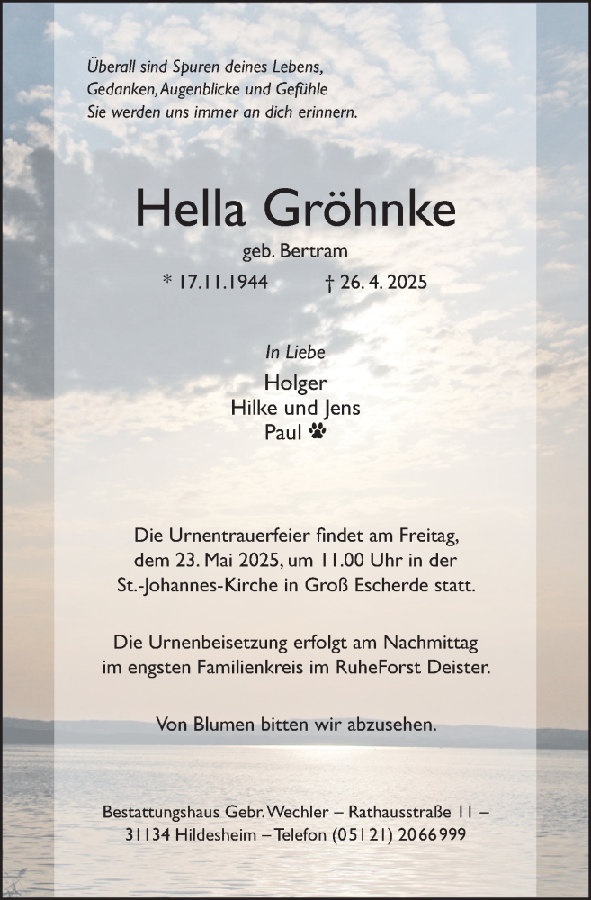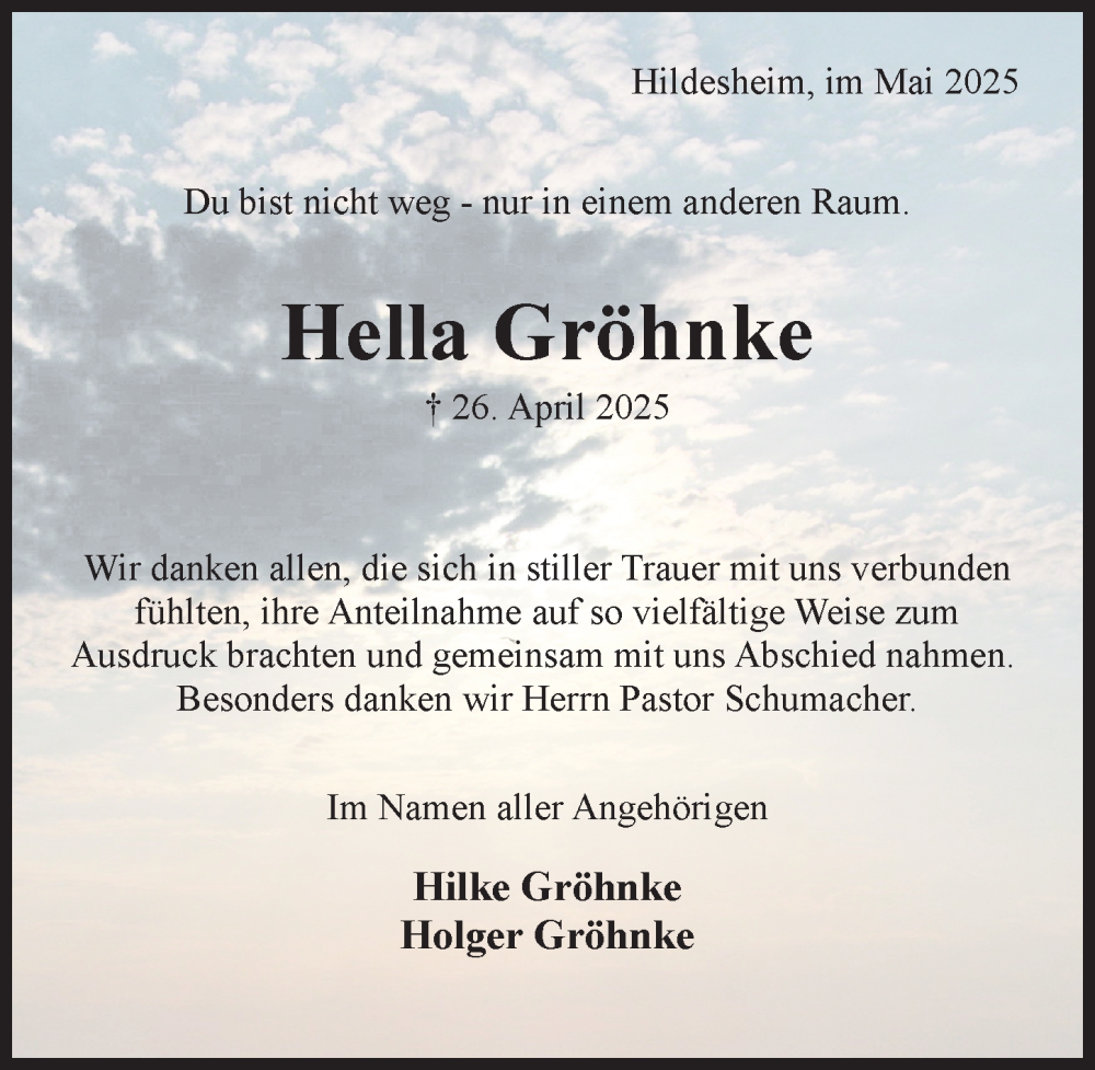 Hier finden Sie alle Traueranzeigen aus der Zeitung, die bisher für Hella Gröhnke erschienen sind. Weitere Traueranzeigen, die in der Zeitung erscheinen, werden hier ebenfalls aufgelistet