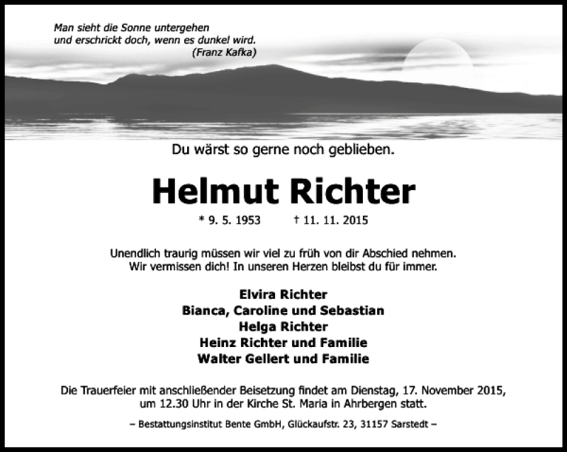 Hier finden Sie alle Traueranzeigen aus der Zeitung, die bisher für Helmut Richter erschienen sind. Weitere Traueranzeigen, die in der Zeitung erscheinen, werden hier ebenfalls aufgelistet