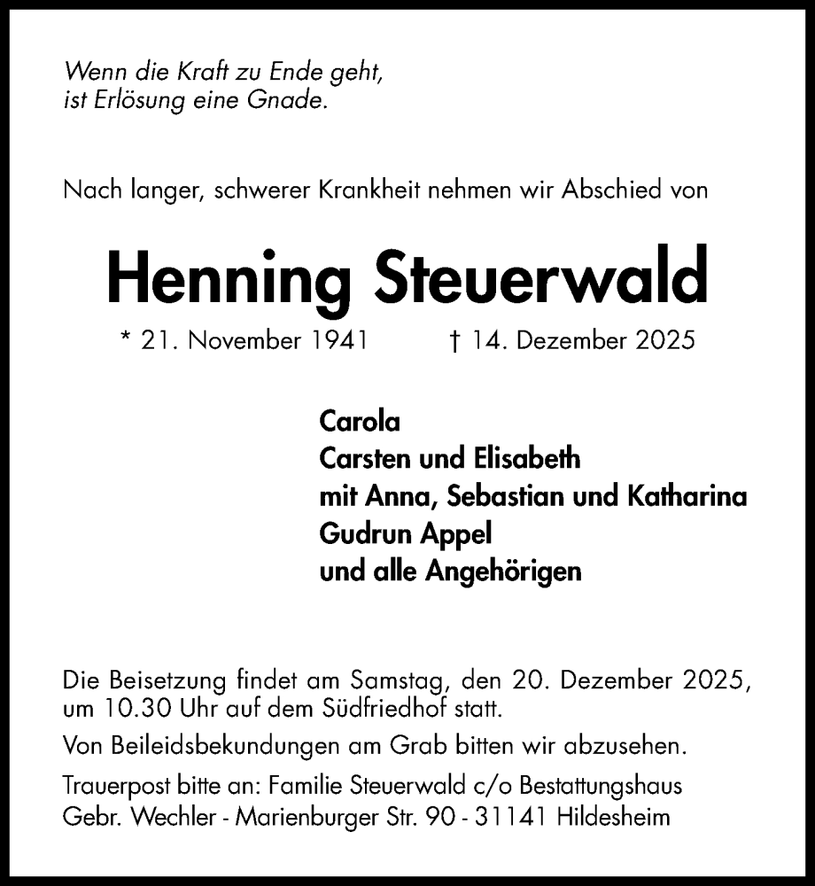 Hier finden Sie alle Traueranzeigen aus der Zeitung, die bisher für Henning Steuerwald erschienen sind. Weitere Traueranzeigen, die in der Zeitung erscheinen, werden hier ebenfalls aufgelistet