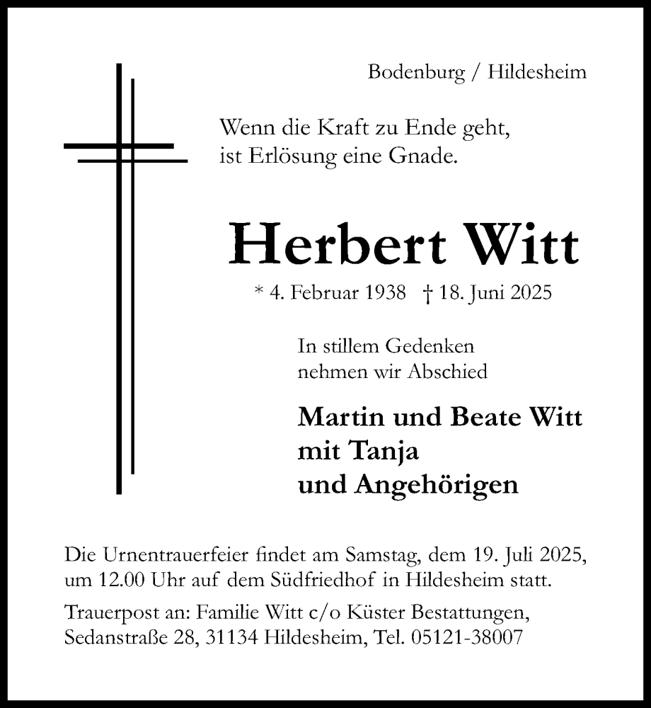 Hier finden Sie alle Traueranzeigen aus der Zeitung, die bisher für Herbert Witt erschienen sind. Weitere Traueranzeigen, die in der Zeitung erscheinen, werden hier ebenfalls aufgelistet