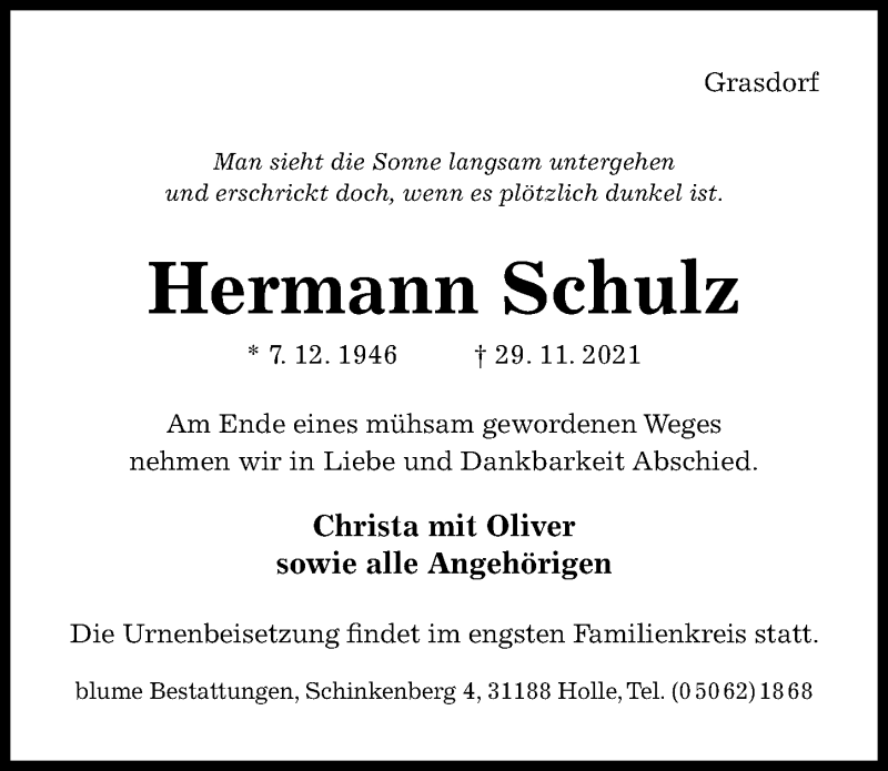 Hier finden Sie alle Traueranzeigen aus der Zeitung, die bisher für Hermann Schulz erschienen sind. Weitere Traueranzeigen, die in der Zeitung erscheinen, werden hier ebenfalls aufgelistet
