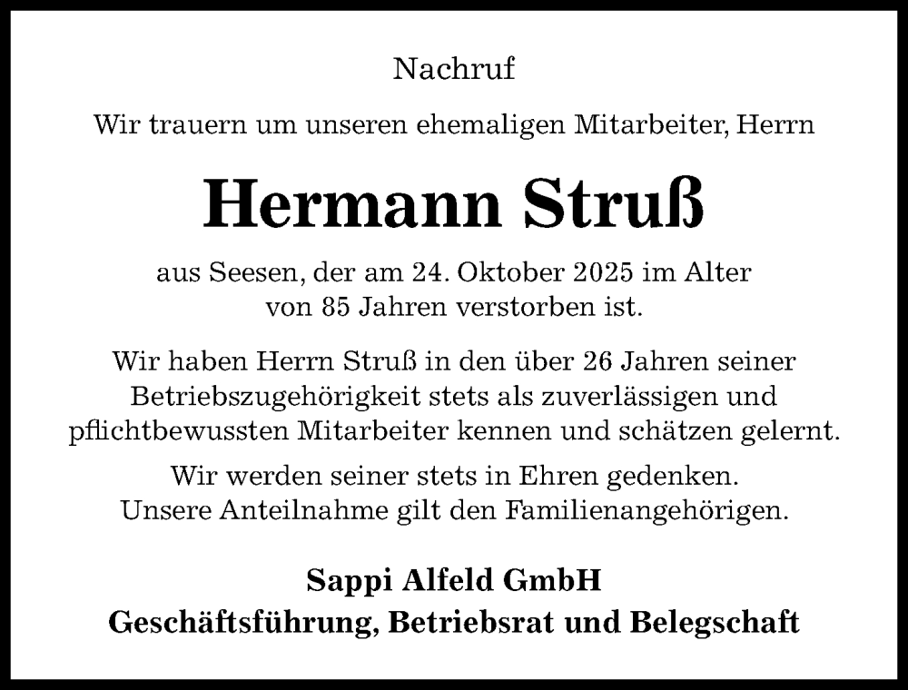 Hier finden Sie alle Traueranzeigen aus der Zeitung, die bisher für Hermann Struß erschienen sind. Weitere Traueranzeigen, die in der Zeitung erscheinen, werden hier ebenfalls aufgelistet