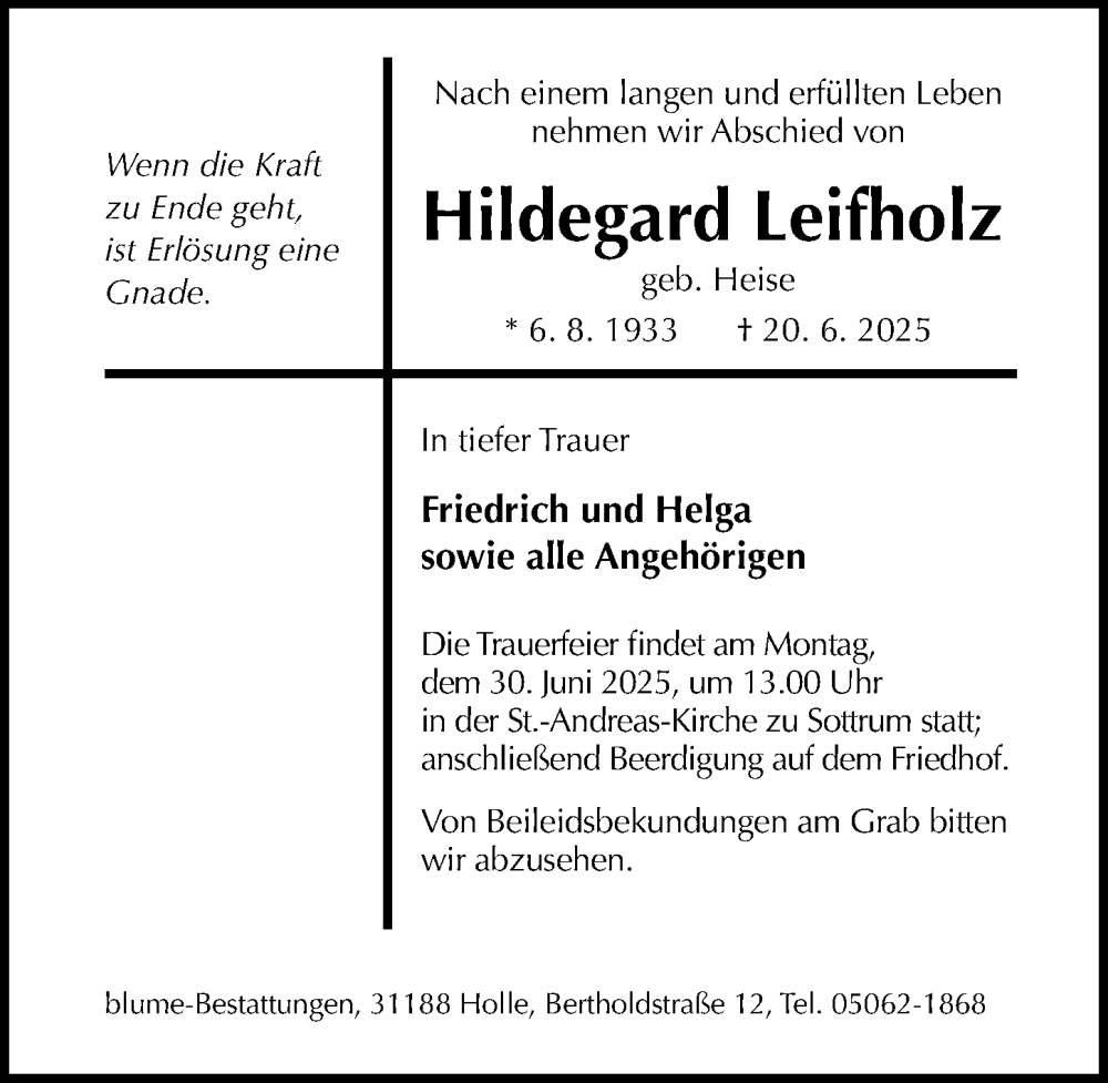 Hier finden Sie alle Traueranzeigen aus der Zeitung, die bisher für Hildegard Leifholz erschienen sind. Weitere Traueranzeigen, die in der Zeitung erscheinen, werden hier ebenfalls aufgelistet