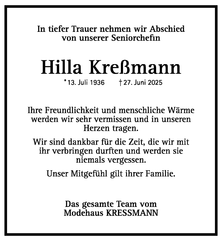 Hier finden Sie alle Traueranzeigen aus der Zeitung, die bisher für Hilla Kreßmann erschienen sind. Weitere Traueranzeigen, die in der Zeitung erscheinen, werden hier ebenfalls aufgelistet