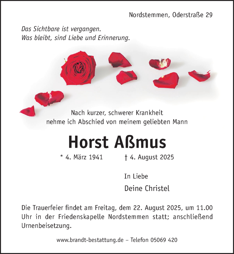 Hier finden Sie alle Traueranzeigen aus der Zeitung, die bisher für Horst Aßmus erschienen sind. Weitere Traueranzeigen, die in der Zeitung erscheinen, werden hier ebenfalls aufgelistet