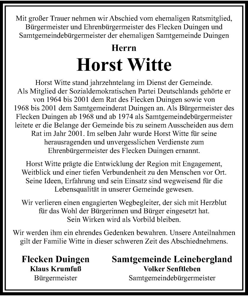 Hier finden Sie alle Traueranzeigen aus der Zeitung, die bisher für Horst Witte erschienen sind. Weitere Traueranzeigen, die in der Zeitung erscheinen, werden hier ebenfalls aufgelistet