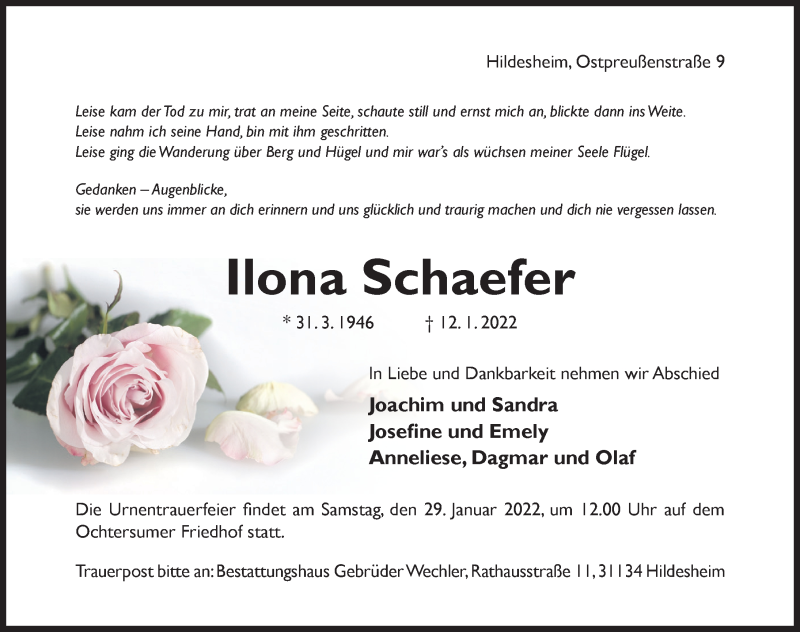 Hier finden Sie alle Traueranzeigen aus der Zeitung, die bisher für Ilona Schaefer erschienen sind. Weitere Traueranzeigen, die in der Zeitung erscheinen, werden hier ebenfalls aufgelistet