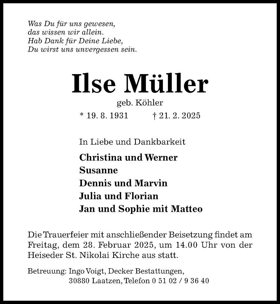 Hier finden Sie alle Traueranzeigen aus der Zeitung, die bisher für Ilse Müller erschienen sind. Weitere Traueranzeigen, die in der Zeitung erscheinen, werden hier ebenfalls aufgelistet