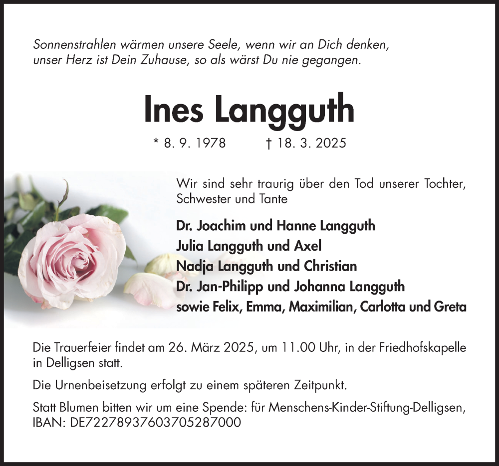 Hier finden Sie alle Traueranzeigen aus der Zeitung, die bisher für Ines Langguth erschienen sind. Weitere Traueranzeigen, die in der Zeitung erscheinen, werden hier ebenfalls aufgelistet