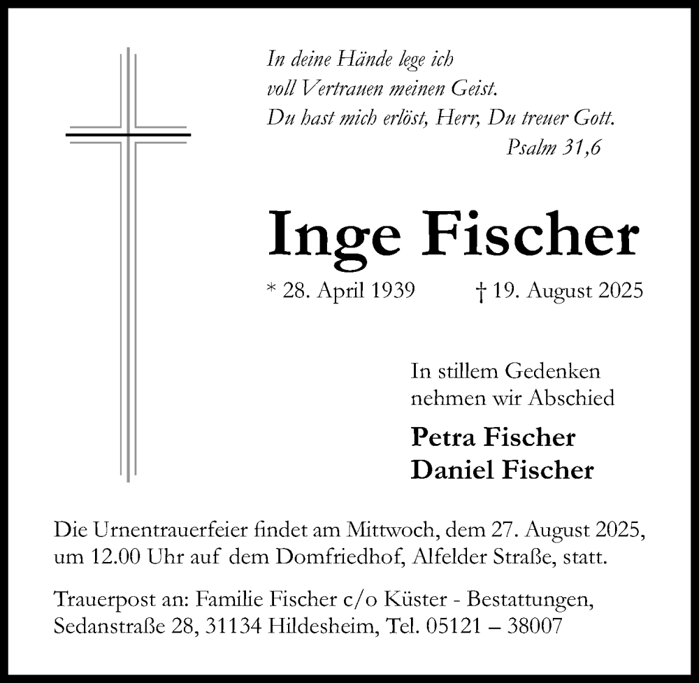 Hier finden Sie alle Traueranzeigen aus der Zeitung, die bisher für Inge Fischer erschienen sind. Weitere Traueranzeigen, die in der Zeitung erscheinen, werden hier ebenfalls aufgelistet