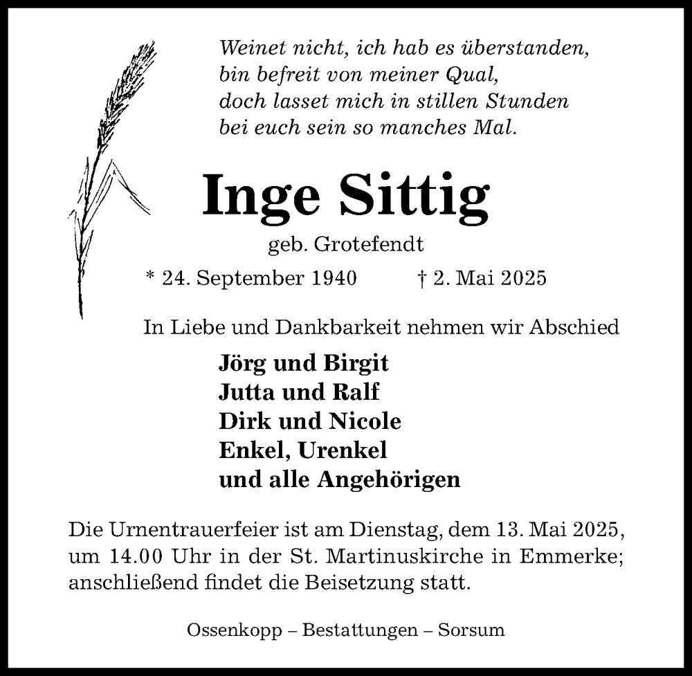 Hier finden Sie alle Traueranzeigen aus der Zeitung, die bisher für Inge Sittig erschienen sind. Weitere Traueranzeigen, die in der Zeitung erscheinen, werden hier ebenfalls aufgelistet