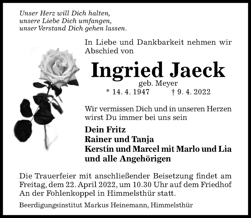 Hier finden Sie alle Traueranzeigen aus der Zeitung, die bisher für Ingried Jaeck erschienen sind. Weitere Traueranzeigen, die in der Zeitung erscheinen, werden hier ebenfalls aufgelistet