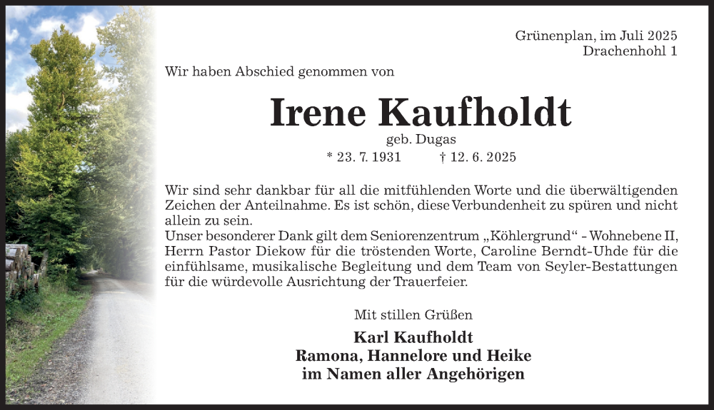 Hier finden Sie alle Traueranzeigen aus der Zeitung, die bisher für Irene Kaufholdt erschienen sind. Weitere Traueranzeigen, die in der Zeitung erscheinen, werden hier ebenfalls aufgelistet