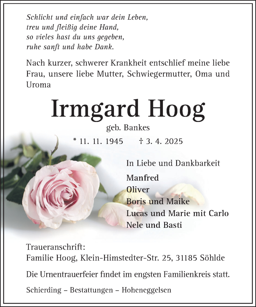 Hier finden Sie alle Traueranzeigen aus der Zeitung, die bisher für Irmgard Hoog erschienen sind. Weitere Traueranzeigen, die in der Zeitung erscheinen, werden hier ebenfalls aufgelistet
